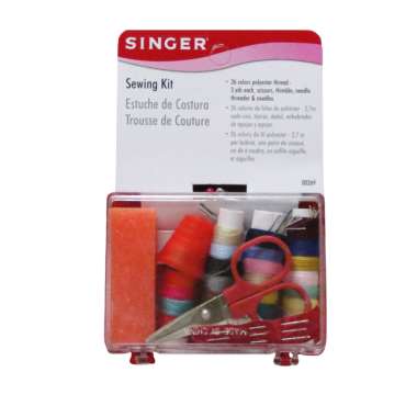 SINGER SEWING KIT IN STORAGE BOX - 34 PCS - INCLUDES MINI SCISSORS, THIMBLE, PIN CUSHION, 3 NEEDLES, NEEDLE THREADER, 26 ASSORTED COLORS THREAD (3 YDS